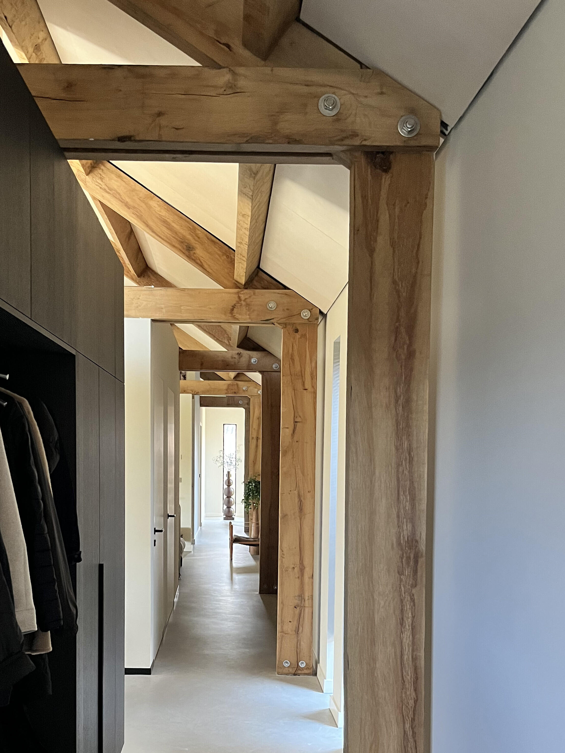 Op de begane grond valt direct de warme en natuurlijke uitstraling van de leefruimten op. Het gebruik van natuurlijke materialen, zoals eiken en peppelhout, die zichtbaar zijn toegepast, versterkt het karakter van de woning. In de entreehal zijn de eiken spanten prominent in het zicht gelaten, wat bijdraagt aan de ruimtelijke beleving.