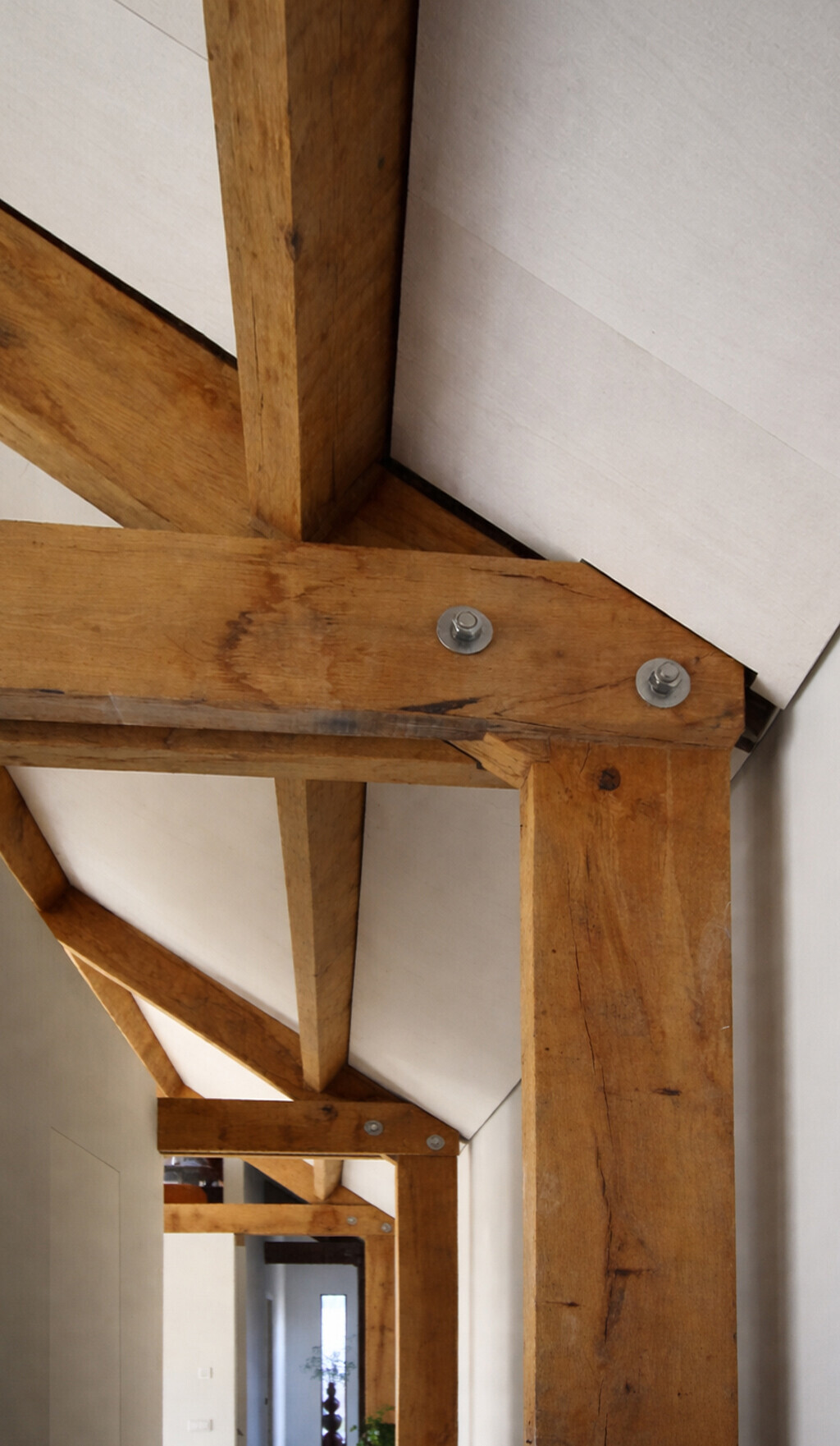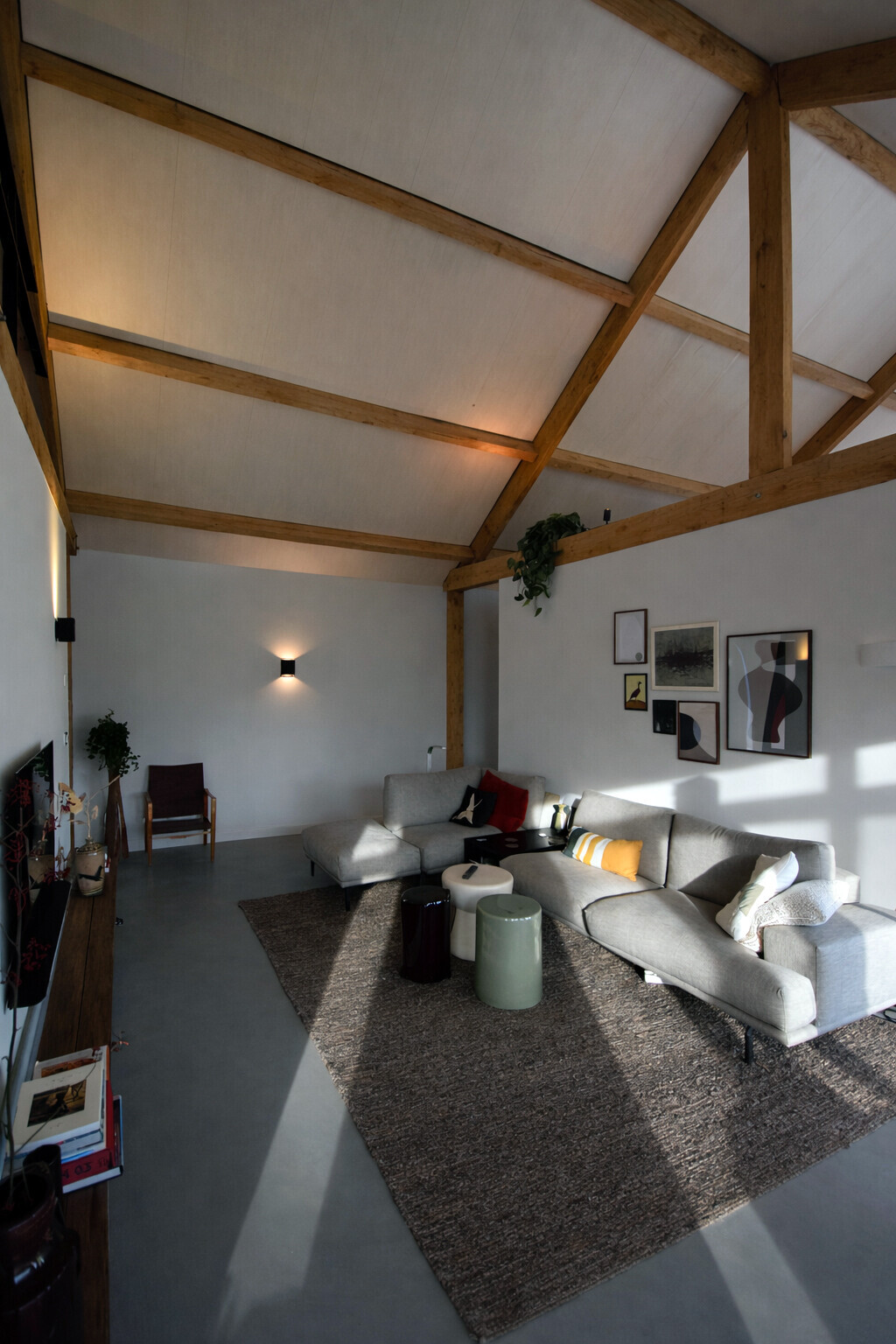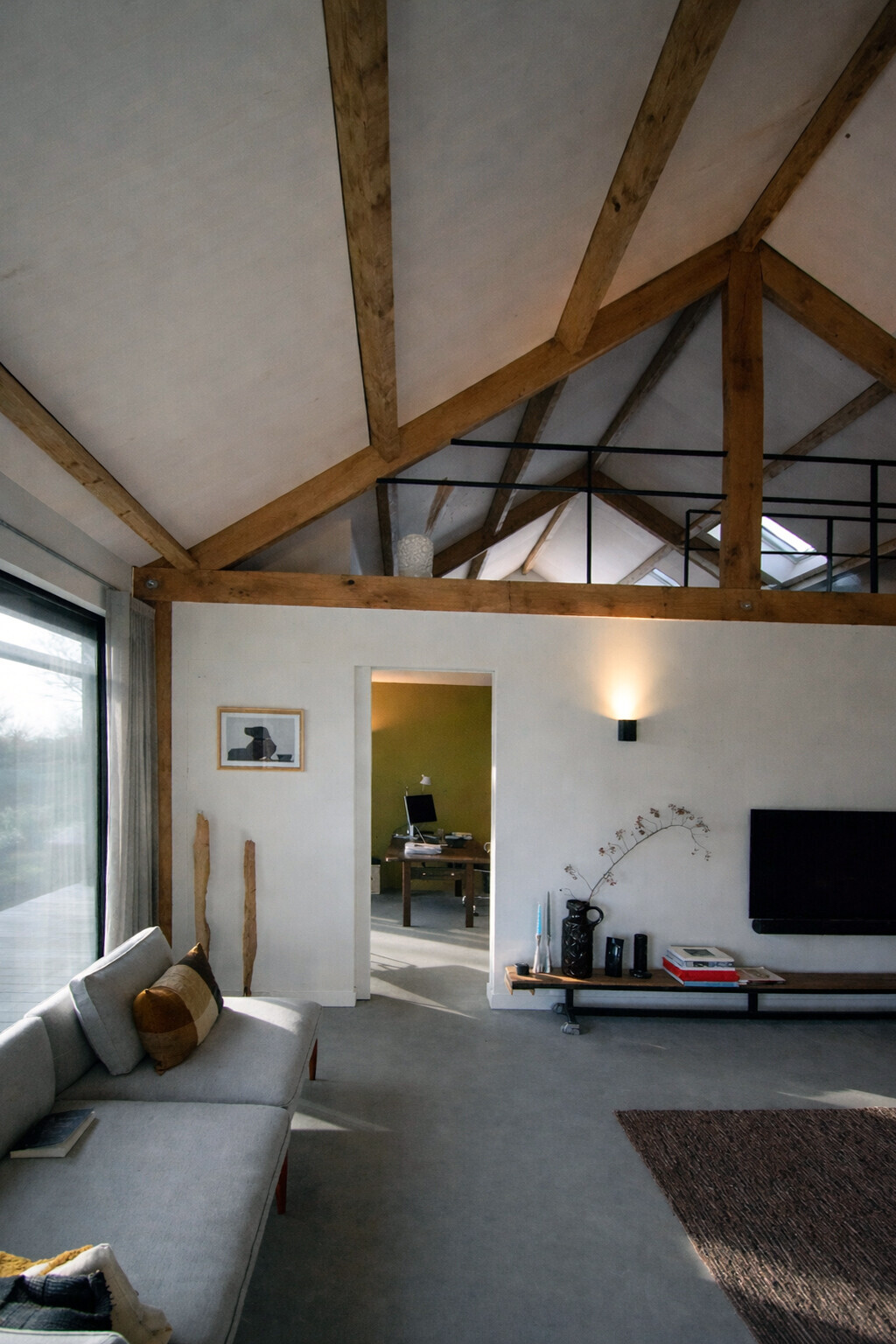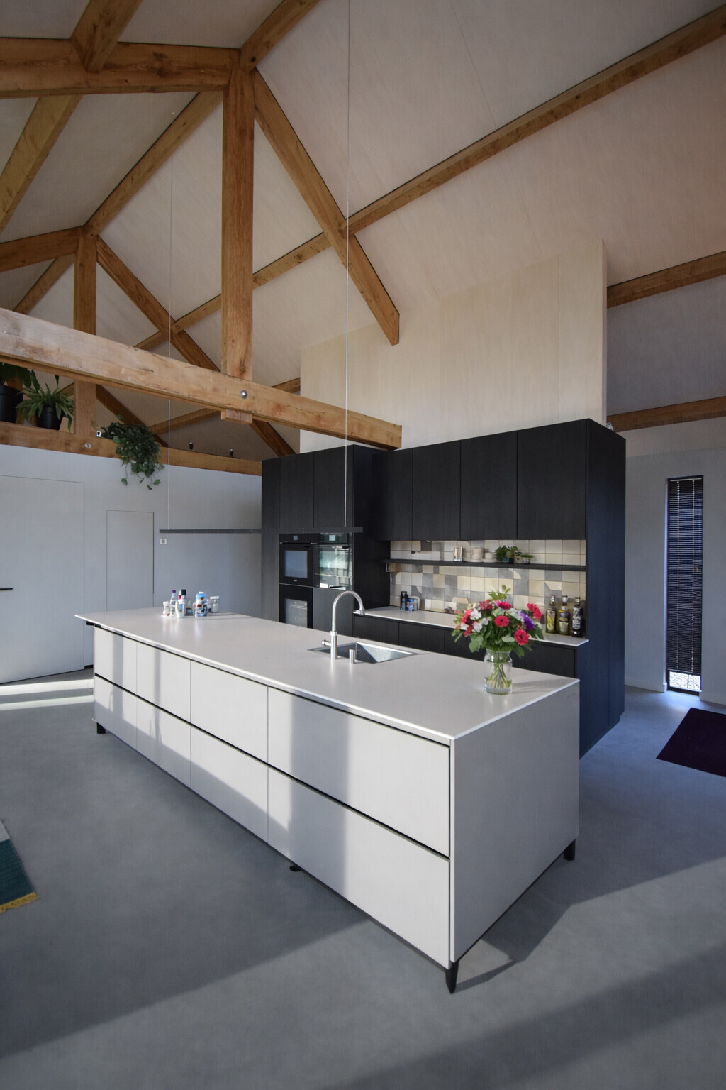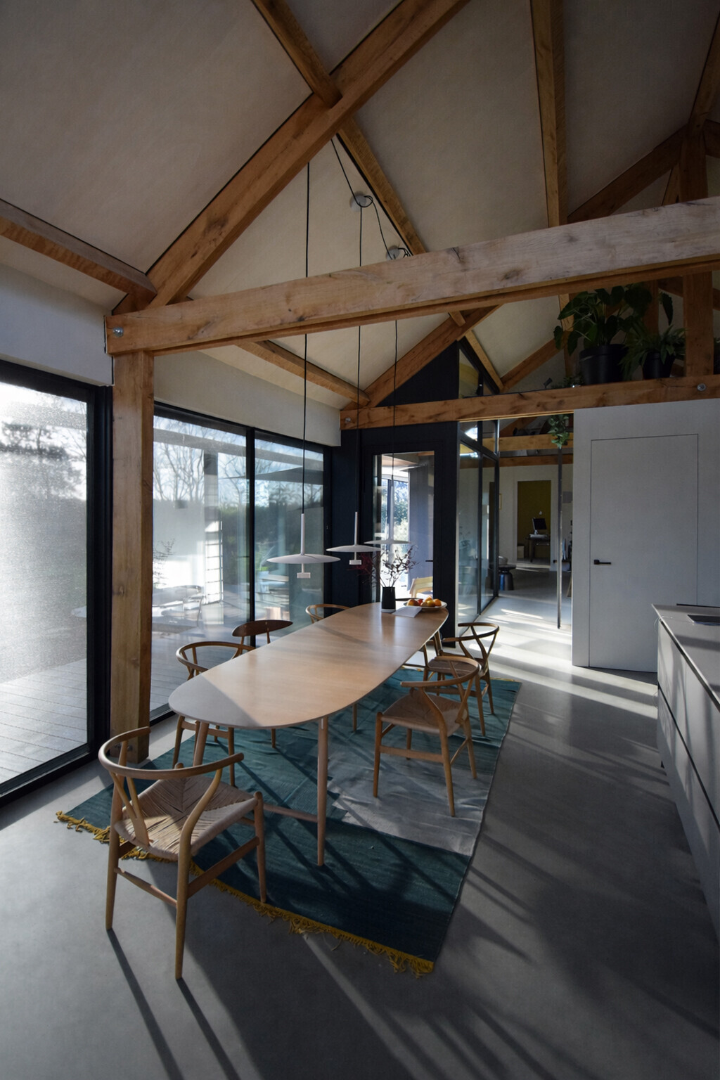 De verschillende verblijfsruimten op de begane grond lopen vloeiend in elkaar over en worden slechts subtiel gescheiden door meer gesloten volumes. De hal aan de noordzijde vormt de verbindende schakel tussen deze ruimtes. Bij de realisatie van de woning is bewust gekozen voor duurzame en lokaal gewonnen materialen, waaronder de eiken spanten en het dakbeschot van peppelhout.