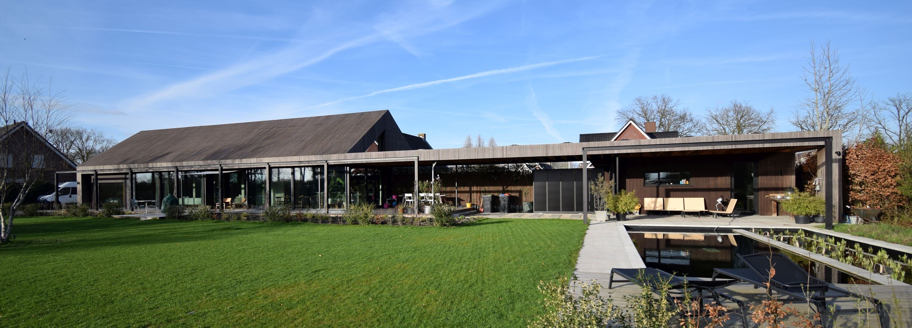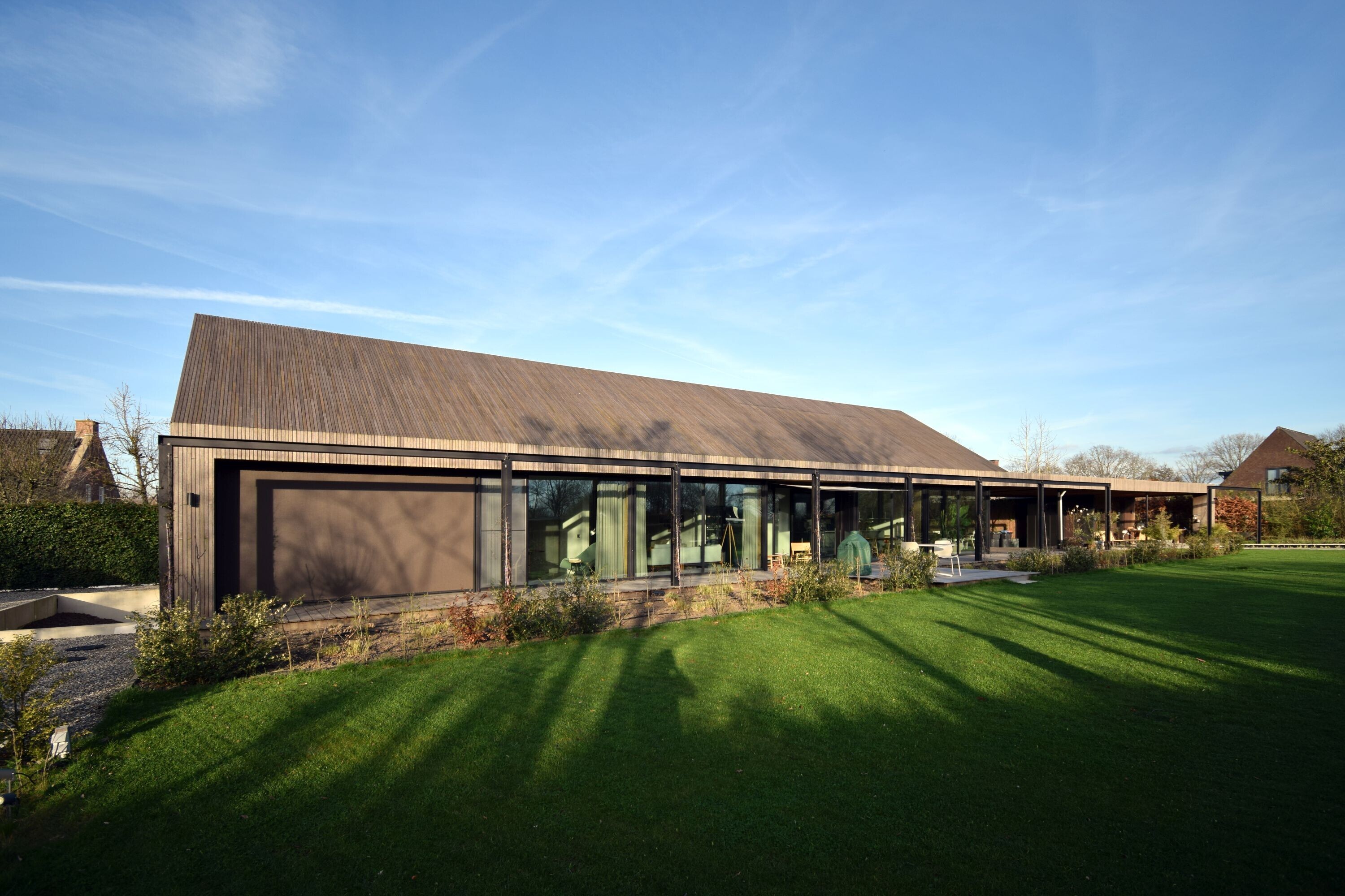 Aan de zuidzijde opent de woning zich met grote glaspartijen naar de buitenruimte. Hierdoor ontstaat een vloeiende overgang tussen binnen en buiten, waarbij het dagelijks leven zich nadrukkelijk op deze zijde afspeelt. Van de eerste ochtendzon tot de laatste zonnestralen van de dag biedt deze gevel aangename verblijfsplekken. Zelfs in de winter zorgt de lage zonstand hier voor een merkbare warmte. Geïntegreerde screens voorkomen oververhitting tijdens warme dagen.