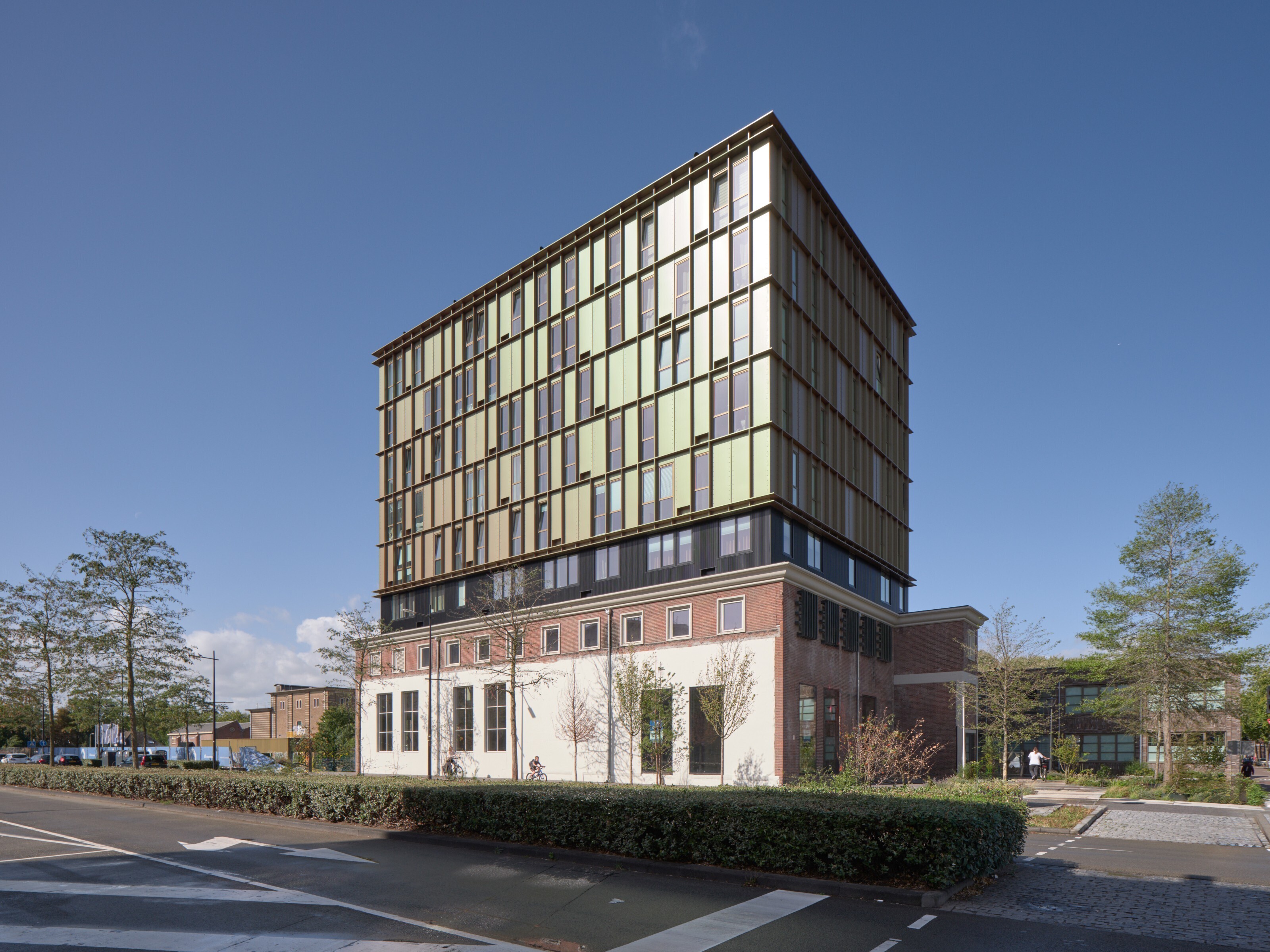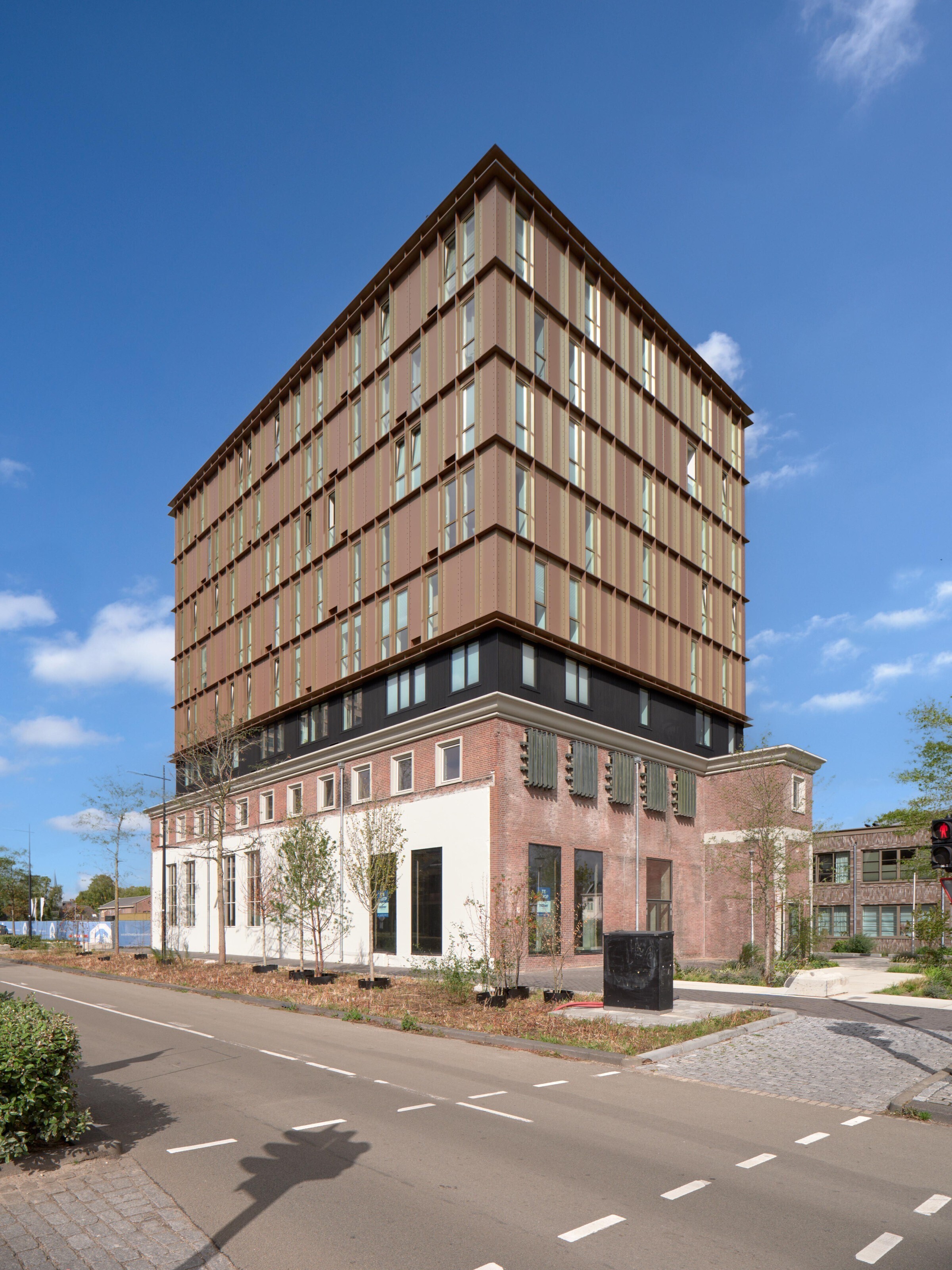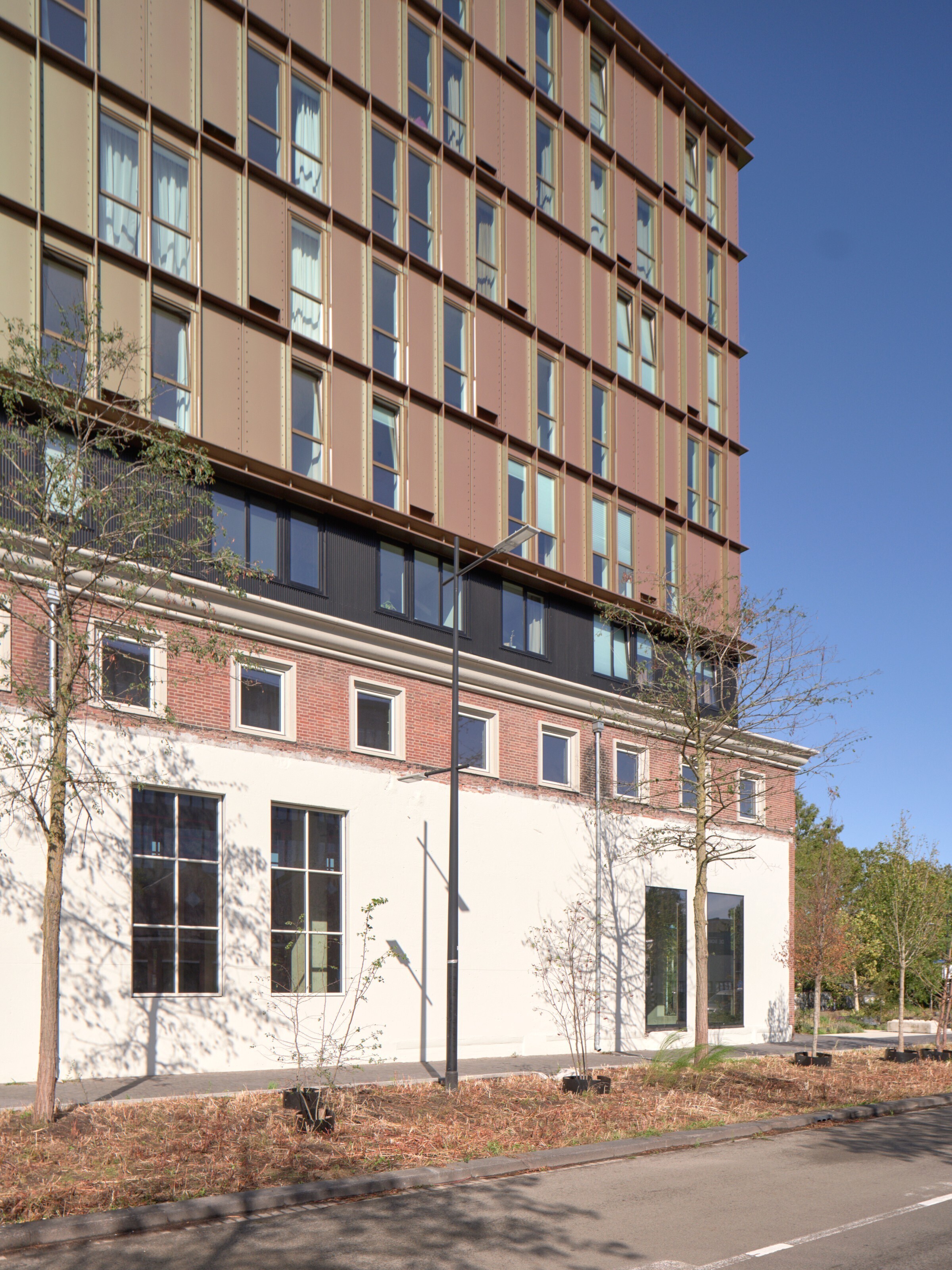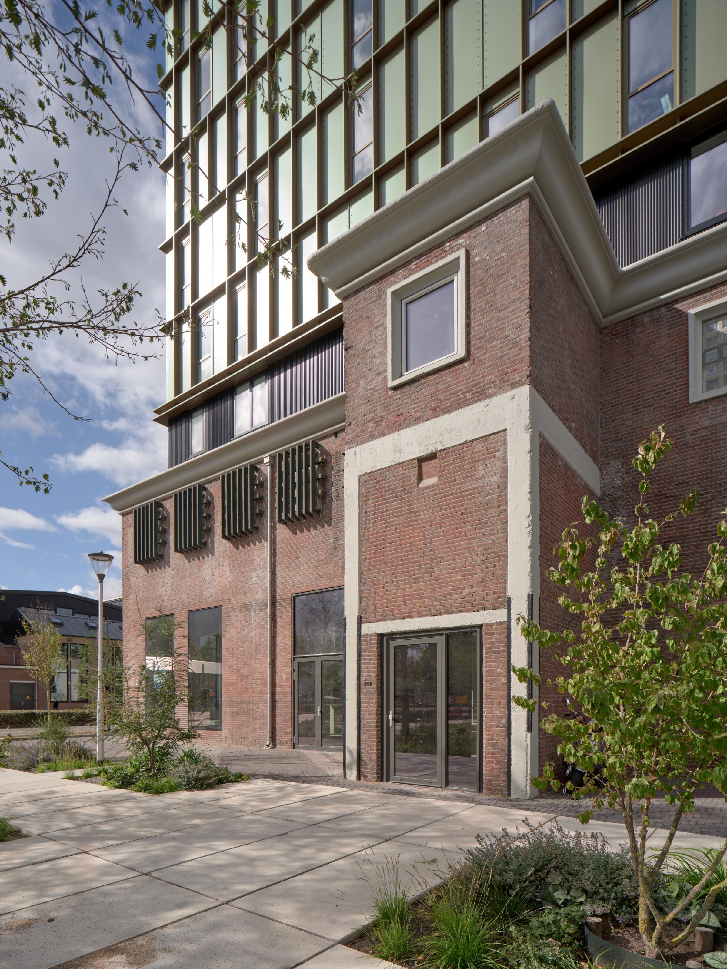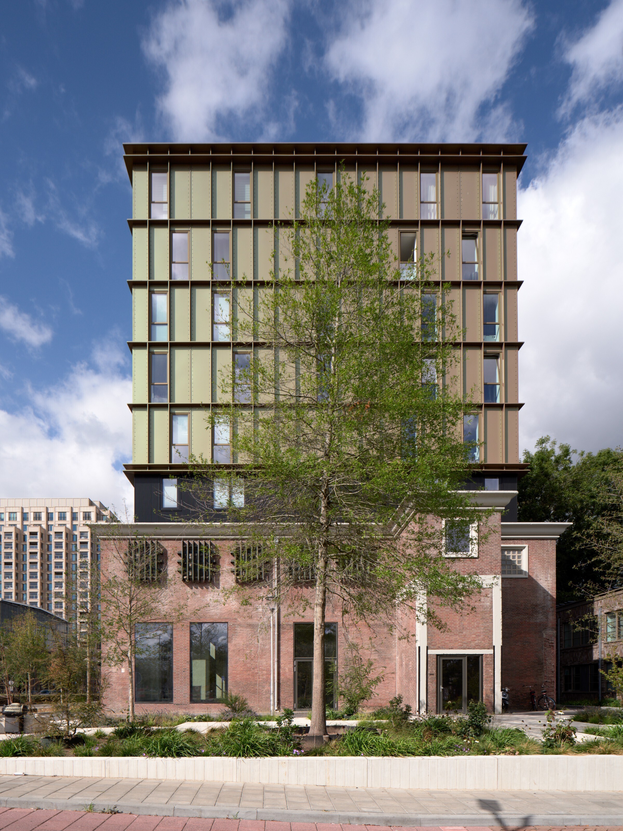 Tussen de bestaande bouw en de nieuwe opbouw is een tussenlaag aangebracht. Deze zorgt ervoor dat het Ketelhuis als zelfstandig volume herkenbaar blijft en dat de nieuwbouw er visueel los van komt te staan. Hierdoor ontstaat een duidelijke en rustige overgang tussen oud en nieuw, waarbij beide lagen hun eigen identiteit behouden.