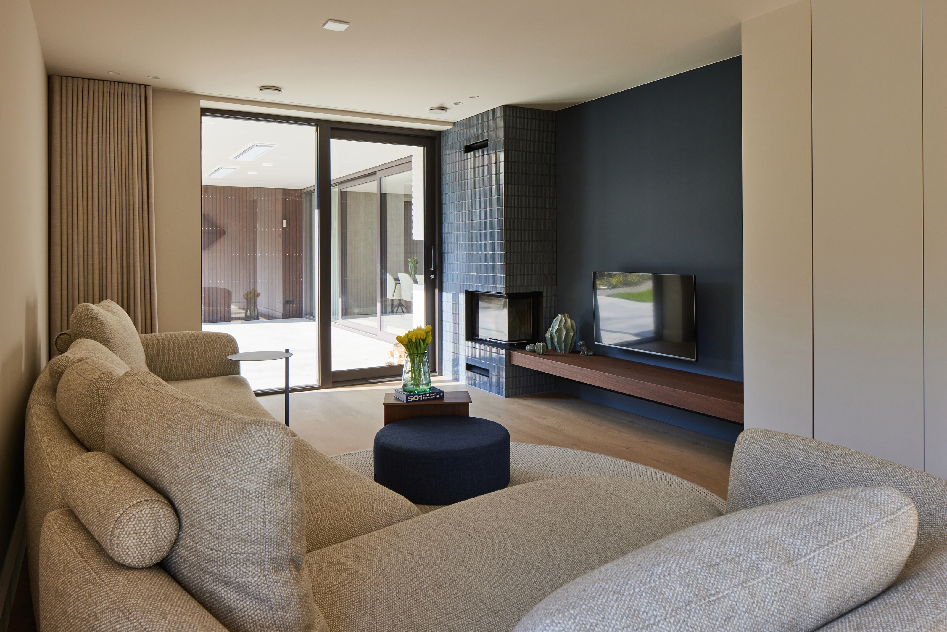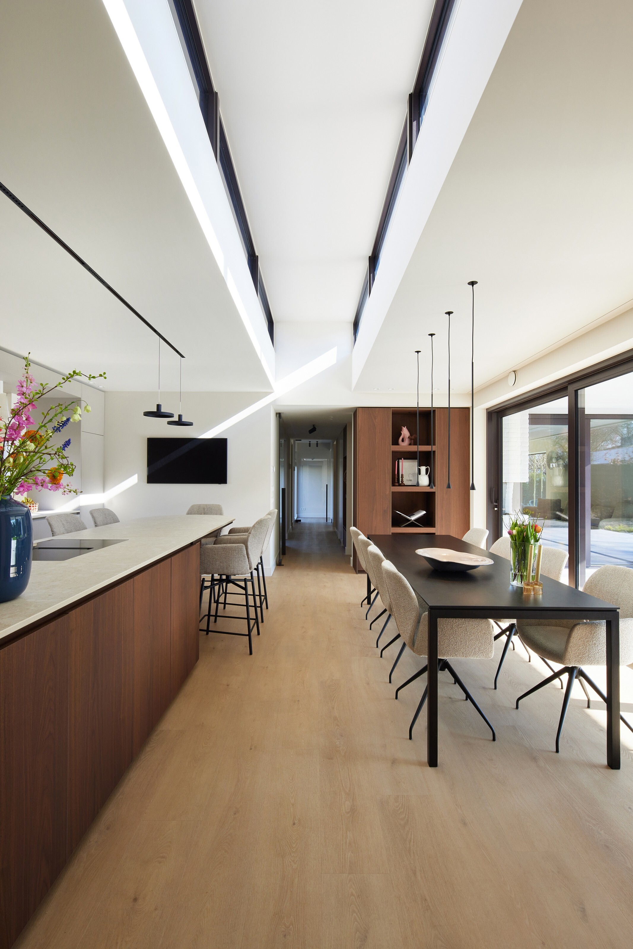 Deze as ontsluit niet alleen de verschillende functies, maar creëert ook een zichtlijn over nagenoeg de volledige breedte van de woning. Door deze ingreep ontstaat een logische flow en een heldere zonering tussen de private ruimten en de collectieve leefruimtes, waarbij de structuur van Mulders in een nieuw, ruimtelijk perspectief wordt geplaatst.