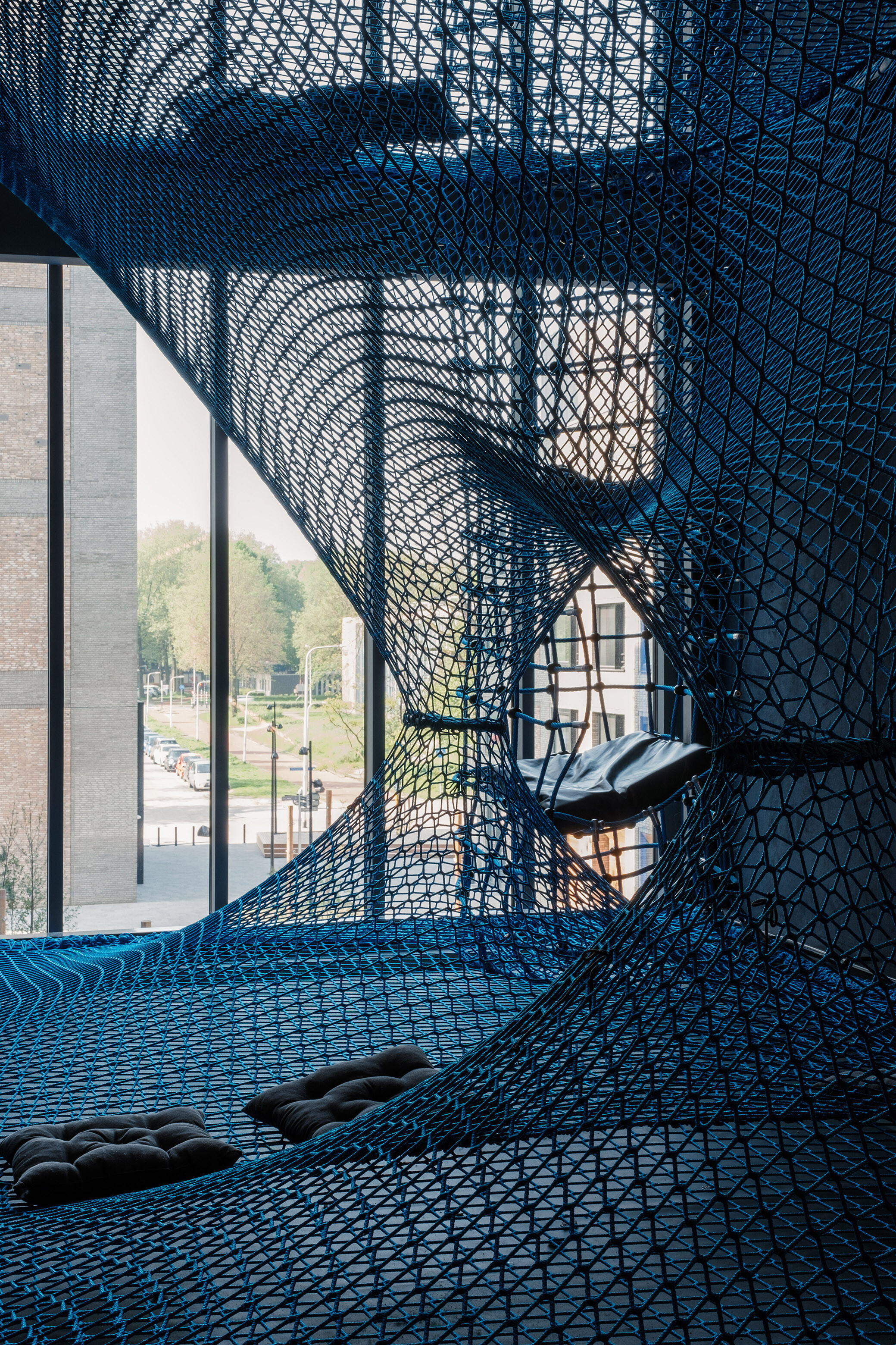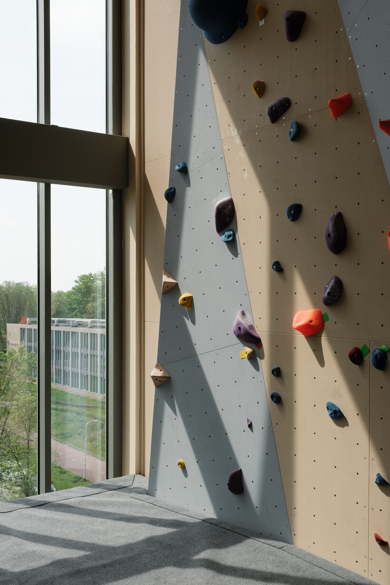 Binnen het gebouw zijn op strategische plekken bijzondere algemene voorzieningen opgenomen. Deze interventies verstoren bewust de regelmaat van de structuur en geven ruimte aan uiteenlopende activiteiten en sferen: van klimhal en jungle room tot bibliotheek en studiezones. Grote vensters markeren deze plekken in de gevel, brengen royaal daglicht binnen en tonen het studentenleven naar de stad.