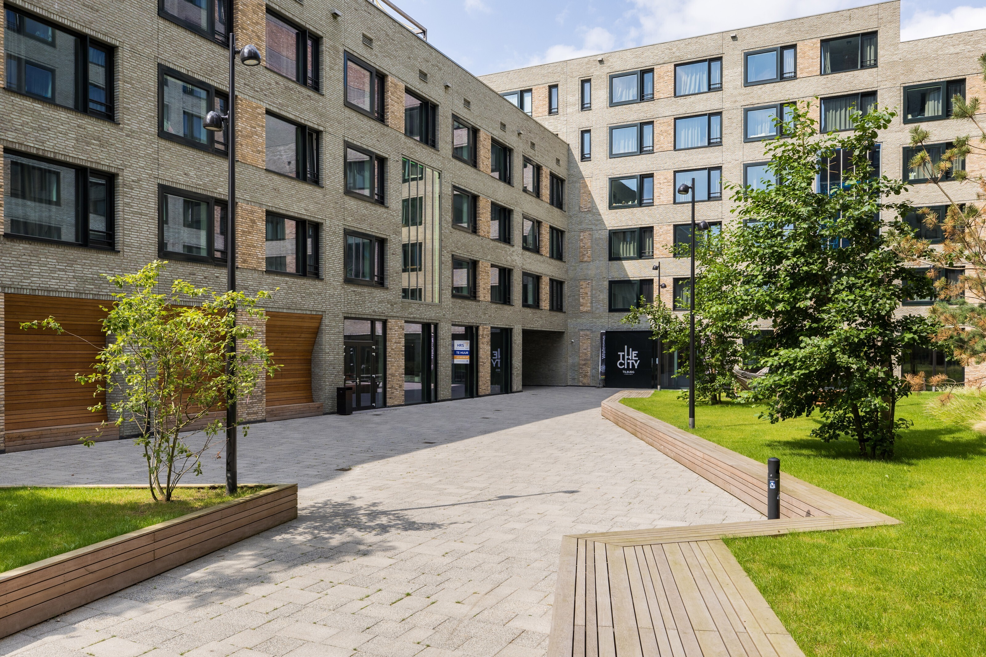 The City vormt een nieuw stedelijk ensemble in het campusgebied. Het complex bestaat uit een U-vormig volume met een binnentuin en een toren, waarbij de begane grond wordt benut voor collectieve functies. De U-vorm creëert een beschutte groene ruimte waar ontmoeten, studeren en ontspannen vanzelfsprekend worden. Het dak van de lage vleugel fungeert als vergroende verblijfsruimte en draagt bij aan klimaatadaptatie en verblijfskwaliteit.