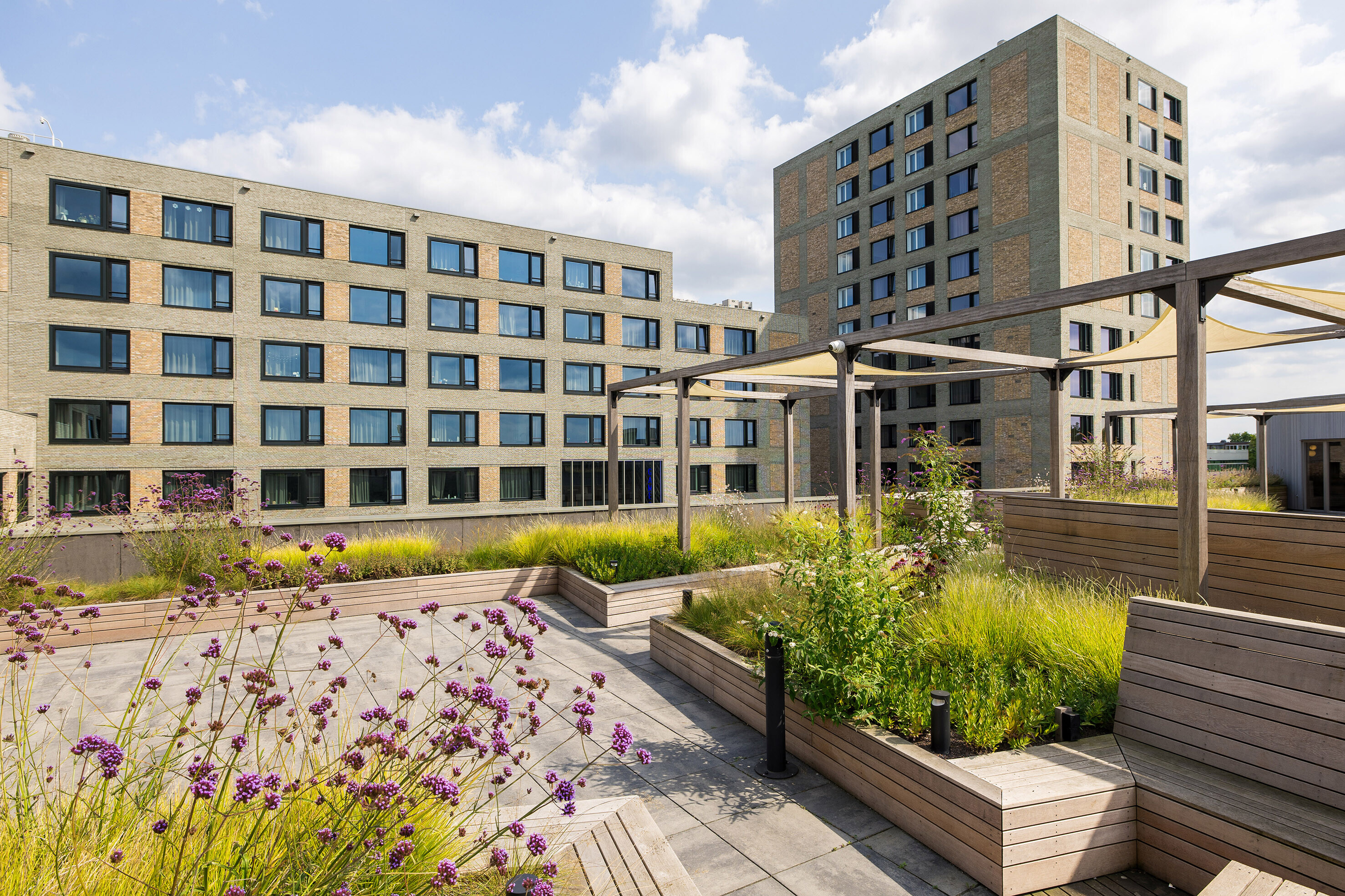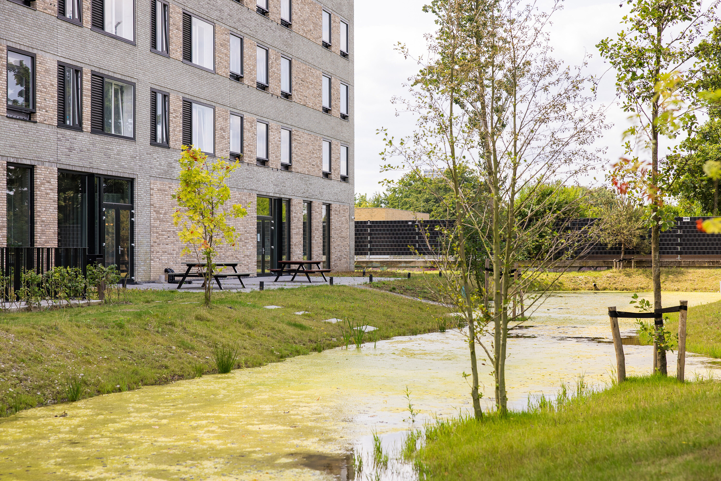 Het resultaat is een levendig woonmilieu waarin diversiteit, ontmoeting en groen centraal staan, en waarin de architectuur actief bijdraagt aan een gezonde campusomgeving.