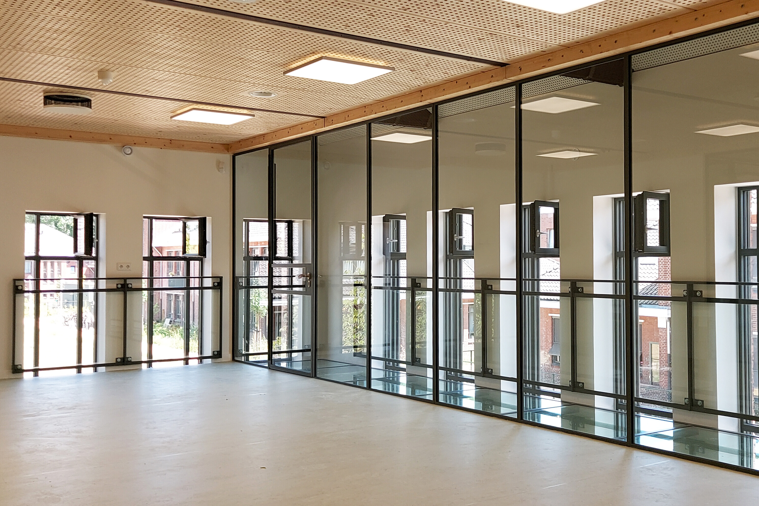De bestaande, royale ruimtes bleken bij uitstek geschikt voor de meer collectieve en bijzondere functies van het kindcentrum. Verborgen kapconstructies zijn weer zichtbaar gemaakt en geven de ruimtes een indrukwekkende ruimtelijkheid. In het voormalige badhuis, nu ingericht als speelzaal, komt dit het sterkst tot uiting: de prachtige spanten, herstelde daklichten en de volledige hoogte van de ruimte zorgen voor een spectaculair en licht interieur.