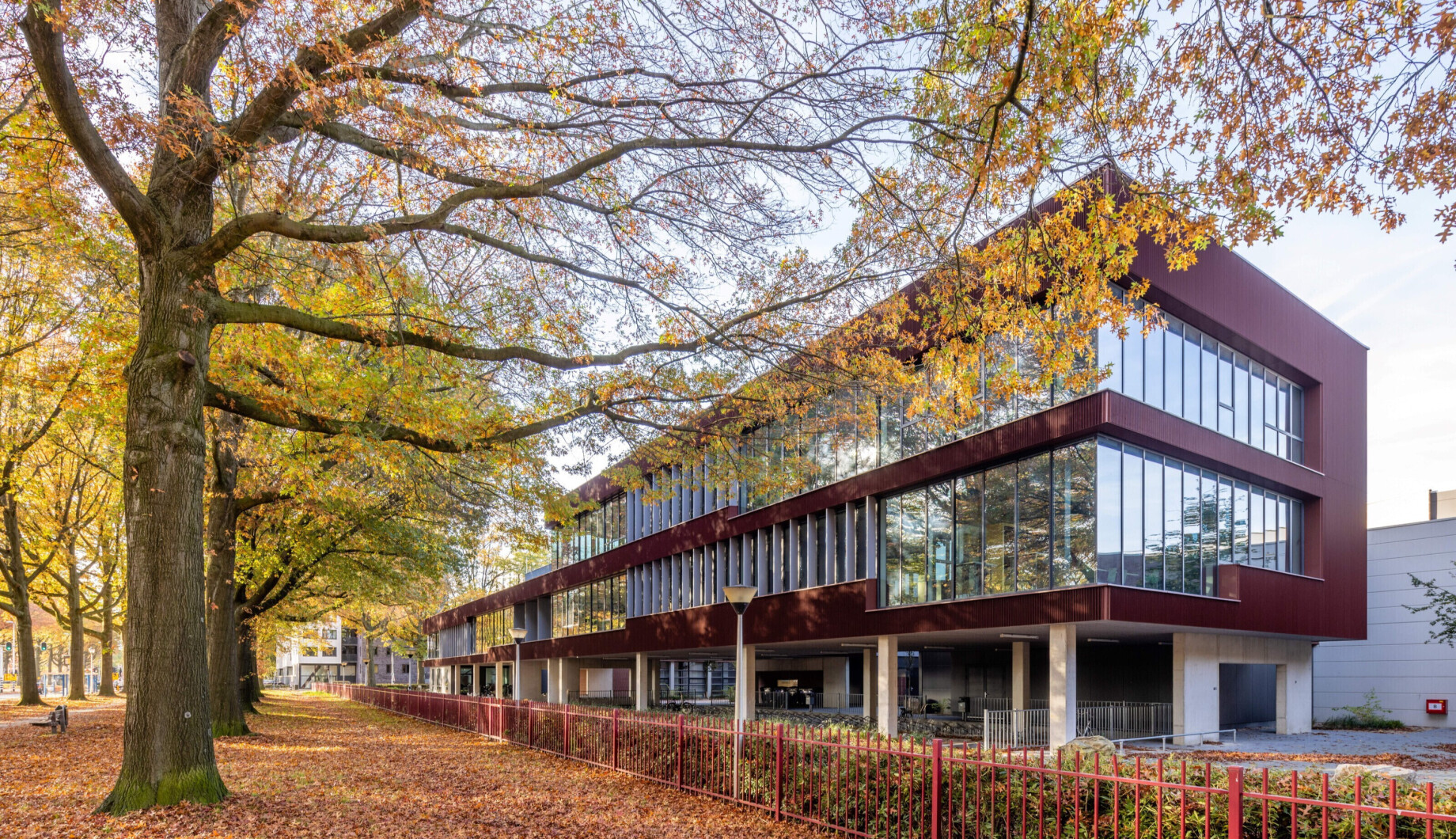 Een verhoogde stoep en een luifel zijn weer ingezet als entree. Betonnen kolommen maken de drie beuken zichtbaar en slanke bronskleurige aluminium kozijnen met een eenduidig ritme refereren naar de eerdere stalen kozijnen. Gestucte gevels en dakranden pakken het geheel samen.